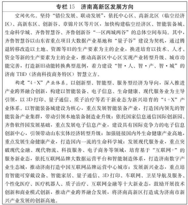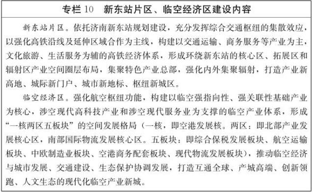 (四)北跨东延,一体发展。落实国家批复的《山东新旧动能转换综合试验区建设总体方案》及省委、省政府“北跨东延”战略支持济南合理调整行政区划的要求,推动实施北跨东延区划调整,在更大范围内统筹资源配置、优化要素组合,加快实现新旧动能转换,提高省会城市首位度,强化济南省会城市群经济圈核心城市地位作用,尽快形成万亿级引擎,促进全省东西部协调发展,助推山东在全国东部地区竞相发展格局中加速崛起。