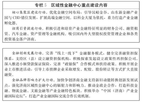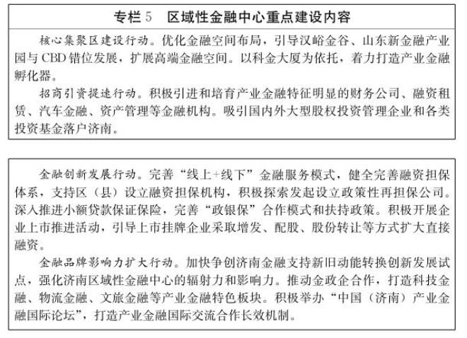 (1)提升金融产业发展水平。丰富金融机构体系,鼓励发起设立和发展壮大商业银行、证券公司、保险公司、信托公司、基金公司、期货公司等持牌法人金融机构,大力发展小额贷款公司、融资租赁公司、商业保理公司、民间资本管理公司等地方金融组织,推进进出口银行在济设立分支机构。用好用活省、市新旧动能转换基金,大力发展天使投资基金、创业投资基金、并购基金等各类股权投资基金,鼓励投资种子期、初创期企业,支持产业并购重组,培育新动能、改造旧动能。超前布局和大力发展金融科技,改造提升传统金融运营和服务模式,提高金融服务实体经济效率。