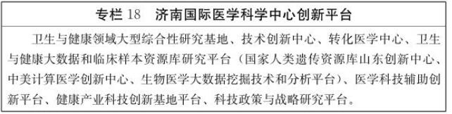 (1)战略布局前沿生物科技。借助国家人类遗传资源库山东创新中心落户济南重大机遇,依托国际医学科学中心建设,加快推进山东基因小镇项目,利用基因库生物信息数据资源,战略布局新一代生物检测技术、新一代基因操作技术、合成生物技术、生物大数据等前沿生物科技。深入推进济南生命科学城建设,加快生物医学、基因检测、诊断试剂、干细胞等生物科技发展。支持齐鲁制药、力诺药业等企业,开展哺乳动物细胞高效表达、小分子靶向药物、微生物合成技术、中药质量控制技术、中药源性分子鉴定技术等生物科技研发。