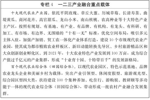 (2)发展多类型产业融合方式。推进农业与加工、旅游、文化、教育、康养等深度融合,塑造终端型、体验型、循环型、智慧型新产业新业态,促进产业链、价值链、供应链融合再造和演化升级。坚持产业园、科技园、创业园和产业融合园四园同建,建设一批现代农业产业园和现代农业综合体(田园综合体)。实施农产品加工业提升行动,引导农产品加工产能向优势产区和加工园区集聚,培育一批年营收过亿元的加工龙头企业。健全农村现代流通服务网络,建立完善市县两级电商服务平台,支持优秀农产品电商企业加快发展。深化“互联网+农业”工程,运用物联网、大数据、云计算、人工智能等技术,改造提升传统农业。推动实施“旅游+农业”行动计划,实施休闲农业和乡村旅游精品工程,打造乡村旅游齐鲁样板。