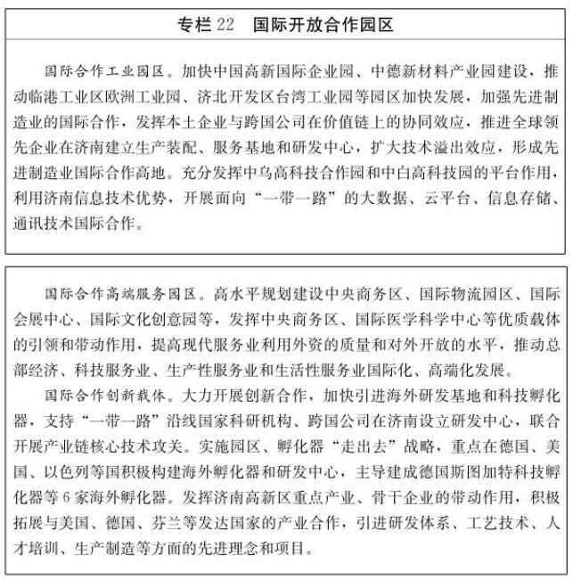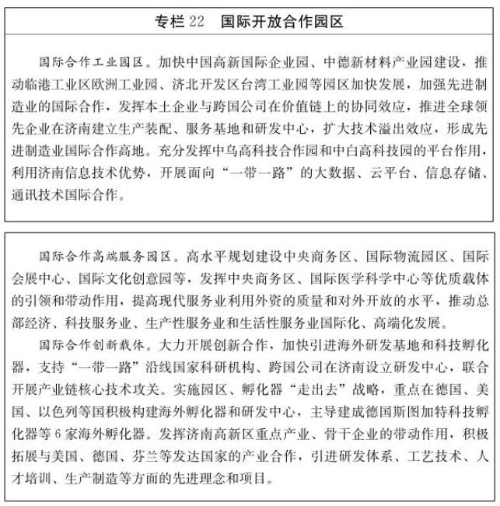 此外,我市还提出,要抓住“一带一路”建设契机,探索有效途径,创新对接机制,以中德产业合作、对接全球高端制造战略为主线,全方位加强国际交流与合作,构筑国际合作平台,建设国际合作中心。实施城市国际化战略,努力提升国际知名度。围绕深化区域交流合作,我市将全面对接京津冀和雄安新区,积极承接北京非首都功能疏解,重点围绕运行后台、咨询服务、法律服务、专业培训、配套保障等方面,促进区域产业梯度转移和协作配套,打造北京非首都功能疏解重要承接地、央企和跨国公司在中国北方的总部基地。加强与京津冀产业规划衔接,主动服务雄安新区建设,探索建立利益分配和共享机制,合作共建重大产业基地和特色产业园区,加快产业要素联动,优化区域合作格局,打造北京、雄安、济南“金三角”,引领环渤海大湾区一体化发展。依托“高铁时代”济南地理区位优势,打造京沪高铁经济带的中部核心支撑点和京沪之间创新创业高地,形成产业链配套、创新链互补、价值链共享的区域协同发展格局。优化区域合作方式,率先推进构建区域间协作发展机制,密切与长江经济带、粤港澳大湾区、东北老工业基地、中原经济区等的经济联系,在先进技术、高端人才、重大项目等合作领域实现新突破。