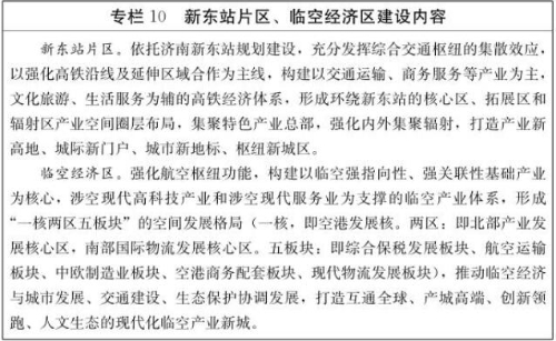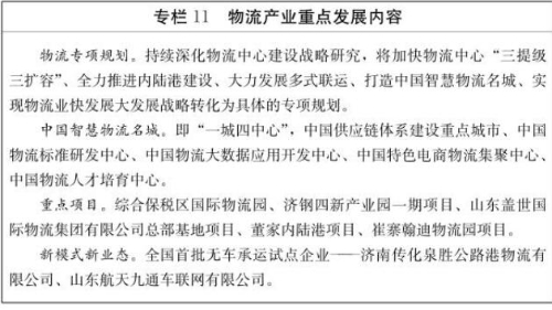1.完善交通基础设施。全方位推进铁路、公路、航空、水运综合运输体系提级扩容,为发展枢纽经济和建设内陆港提供支撑。制定城市内环、中环、外环“三环十二射”交通网络规划,推进济郑、济滨、济莱等高速铁路建设,完善“米”字形高铁网,建设董家镇铁路货运枢纽,实施济南机场扩建工程,推进济南综合保税区迁建,实施小清河复航工程,优化跨黄河桥隧布局,推进城市、市域(郊)轨道交通网络建设,提升城市整体运行效率和综合效益。加快建设、申报国家一类铁路开放口岸,开辟更多国际航空货运新航线,争取设立空港保税物流中心,打造全国重要的航空港经济集聚区。加快推进“1+6”经济圈城际配送体系建设,建设济南国际多式联运中心,争创国家级物流标准化试点城市、国家级多式联运示范工程,积极申报完善口岸功能,着力将济南打造成为“中国智慧物流名城”。