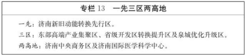 我市提出,要坚持空间布局与功能定位相统一,结合城市中心、次中心、卫星城布局结构,合理规划城市功能分区,明确重点区域功能定位,以各类产业功能、城市功能载体为依托,积极构建生态、生产、生活空间相协调,与城市规模、产业发展、生态容量相适应的城市功能布局,着力打造“一先三区两高地”核心支撑,统筹区域、县域联动发展,加快形成特色鲜明、错位发展、相互支撑的新旧动能转换空间格局。“一先三区两高地”即:一先为济南新旧动能转换先行区,三区为东部高端产业集聚区、省级开发区转换提升区及泉城优化升级区,两高地为济南中央商务区及济南国际医学科学中心。
