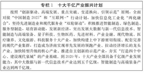在产业升级提升发展质量方面,按照“创新驱动、高端发展、重点突破、变道换向、引领示范”原则,全面对接“中国制造2025”和“互联网+”行动计划,加快信息化工业化“两化融合”,坚持先进制造业和现代服务业“双轮驱动”,积极推进智能制造、绿色制造、服务型制造,培育新动能,发展新经济,突出发展大数据与新一代信息技术、智能制造与高端装备、量子科技、生物医药、先进材料、产业金融、现代物流、医疗康养、文化旅游、科技服务十大产业,加快构建上中下游密切衔接、配套完善的现代产业集群,打造成为济南实现率先发展的领跑产业、拉动经济增长的龙头产业、加快转型升级的核心产业、推进自主创新的示范产业,夯实“打造四个中心、建设现代泉城”的产业基础。到2020年,十大产业全部具备千亿级产业发展能力,其中大数据与新一代信息技术产业达到五千亿级,智能制造与高端装备产业达到两千亿级。