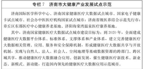 (1)促进医疗健康消费。加快济南国际医学科学中心建设,开展国家健康医疗大数据试点,培育壮大章丘东部医疗中心健康养老基地等医疗健康园区。促进精准医疗、养生保健、智慧医疗、健康管理、医疗美容、口腔医疗、母婴照护等健康服务发展,构建完善健康消费体系,多渠道、多层次满足居民医疗健康消费需求。挖掘健康保险消费市场,丰富商业健康保险产品和服务,引导保险机构开发重大疾病保险、特定疾病保险等与基本医保相衔接的健康保险产品,以及长期护理保险、失能收入损失保险、医疗责任险等多样化保险产品。
