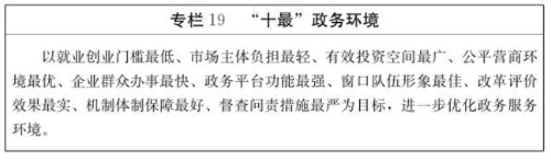 1.打造“十最”政务环境。深化商事登记制度改革,加快“多证合一、一照一码”“证照分离”“名称自主申报”、住所申报制、全程电子化登记等改革,降低市场主体创设门槛,提高商事登记效率。深化行政审批制度改革,结合机构改革,开展相对集中行政许可权改革,在市、区(县)和市属省级以上开发区依托政务服务管理机构,建立行政审批服务局,实行“一枚印章管审批”。持续改进政务服务,完善跨地区远程办理、跨层级联动办理、跨部门协同办理机制。深入推进“互联网+政务服务”,加快实现部门系统整合共享、协同应用,清理修订不适应“互联网+政务服务”的政策法规规定,确立电子证照、电子文书、电子印章等法律效力,让更多事项在网上办理,确需现场办理的“只进一扇门”“最多跑一次”。积极开展“减证便民”行动,凡没有法律法规依据的一律取消,能通过个人现有证照来证明的一律取消,能采取申请人书面承诺方式解决的一律取消,能被其他材料涵盖或替代的一律取消,能通过网络核验的一律取消,开具单位无法调查核实的证明一律取消。加强事中事后监管,全面推行“双随机、一公开”监管,加强监管平台建设,加大稽查执法力度,推进跨部门、跨领域综合执法、联合执法,对新技术、新产业、新业态、新模式发展实施包容创新审慎监管制度,建立快速服务响应机制,全面提升服务和监管水平。