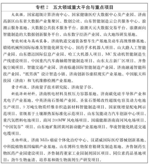 围绕“聚焦前沿技术,引领产业变革”,我市提出了塑造大数据产业优势、打造智能制造产业高地、巩固量子科技先发优势、布局新能源新材料产业、推进生物产业创新发展五大目标。其中,要抓好济南高新区首批山东省大数据产业集聚区建设,规划济南高新区中心区大数据产业基地,集聚大数据技术研发机构、应用主体、众创空间和大企业总部,加快形成聚合发展效应,争创国家级大数据集聚区。在氢能领域,我市提出“建设全国氢能源科技产业高地”的目标。围绕“提升传统产业,加快转型发展”,我市提出了智慧化服务化升级传统制造、“接二连三”振兴现代农业、产融结合赋能实体经济、品牌质量引领品质经济等举措。在消费升级方面,我市提出,要加快济南国际医学科学中心建设,开展国家健康医疗大数据试点,培育壮大章丘东部医疗中心健康养老基地等医疗健康园区。发挥省会城市教育资源优势,积极推进世界一流大学和一流学科建设,支持山东大学发展,高水平建设新齐鲁工业大学、山东第一医科大学。探索公办民助、民办公助、集团化办学等办学模式,扩大非学历教育消费市场规模。在创优发展模式方面,我市提出,要依托省会城市科教人才、金融资源、医疗资源富集优势,把发展总部经济作为区域性经济中心建设的重点任务,打造央企和跨国公司北方总部基地。而且,要突出打造中央商务区总部经济高地,错位发展汉峪金谷、山东新金融产业园、经七路-泺源大街老城核心区等总部经济聚集区。大力发展枢纽经济,积极建设“内陆港”,打造集路港、空港、保税港、信息港“四港合一”的国际内陆港中心城市,强化陆海联动、多式联运枢纽功能,构筑“一带一路”新亚欧大陆桥重要支点,增强国家区域性物流中心辐射带动作用。