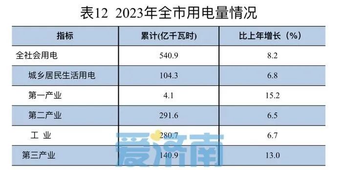 全社会用电量稳步增长。全社会用电量540.9亿千瓦时,比上年增长8.2%,其中,居民生活用电量104.3亿千瓦时,增长6.8%。分产业看,第一产业用电量4.1亿千瓦时,增长15.2%;第二产业用电量291.6亿千瓦时,增长6.5%;第三产业用电量140.9亿千瓦时,增长13.0%。工业用电量280.7亿千瓦时,占全社会用电量比重51.9%,增长6.7%。