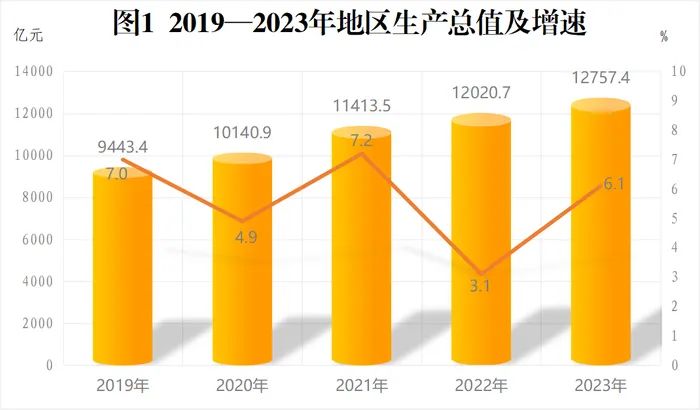 经济总量稳步提升。根据市级生产总值统一核算结果,2023年全市地区生产总值[2]12757.4亿元,按不变价格计算,比上年增长[3]6.1%,其中,第一产业增加值429.5亿元,增长4.1%;第二产业增加值4312.0亿元,增长7.8%;第三产业增加值8015.9亿元,增长5.2%。三次产业构成比3.4:33.8:62.8。